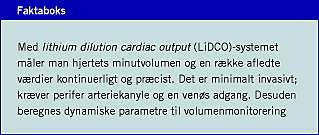 Summary Hemodynamic monitoring with the lithium dilution cardiac output (LiDCO) system Ugeskr Læger 2008;170(7):522-524 The lithium dilution cardiac output (LiDCO) system measures cardiac output beat-to-beat with high precision. The system is based on an arterial pulse power analysis which is calibrated every eight hours with a small non-pharmacological dose of lithium. The system is minimally invasive; it requires only a peripheral arterial catheter and a venous access. Dynamic parameters for early goal-directed therapy are also provided.