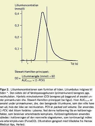 Ved litiumfortyndingsmetoden indgives en lille, ikkefarmakologisk bolus lithiumchlorid (0,15-0,3 mmol) intravenøst. Via en peristaltisk pumpe trækkes arterielt blod med en hastighed på 4 ml/min forbi en litiumionselektiv elektrode (litiumsensoren), der er tilkoblet arteriekanylen. Sensoren er den centrale del af systemet, og spændingen over denne litiumselektive membran er relateret til plasmalitiumkoncentrationen [5]. Der korrigeres for plasmanatrium, som ved fravær af litium bestemmer basisspændingen over membranen. Hjertets minutvolumen (CO) udregnes ved hjælp af arealet under den beregnede førstepassagekurve (primærkurven) for litiumkoncentrationen over tid (Figur 2 ).