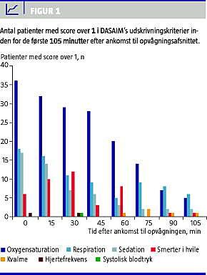 Dansk Selskab for Anæstesiologi og Intensiv Medicin (DASAIM) introducerede i 2004 et nyt sæt anbefalinger for udskrivningspraksis, der blandt andet omfattede et scoringssystem, som er baseret på en række udskrivningskriterier. Implementeringen af dette system blev på vores opvågningsafsnit afsluttet i løbet af efteråret 2006. Vi har tidligere afrapporteret data vedrørende smerter, postoperativ kvalme og opkastning (PONV) og sedation på opvågningsafsnittet og på sengeafsnittet. Formålet med nærværende artikel er med udgangspunkt i de enkelte udskrivningskriterier, der indgår i DASAIM's scoringssystem, at afdække, hvorfor patienter, der er opereret for brystkræft, ligger på opvågningsafsnittet.