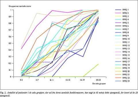 For at vurdere betydningen af de enkelte spørgsmåls indflydelse på den totale RMQ-score er der udført følgende simple grafiske fremstilling (Fig. 1 ) . En sådan simpel fremstilling er mulig, fordi RMQ har ja/nej-svar. Patienterne blev delt i seks grupper ud fra deres samlede funktionsscore (0-3, 4-7, 8-11, 12-15, 16-19, 20-23 point). Kurverne (Fig. 1) viser, hvor mange der har sagt ja til netop dette spørgsmål for hvert af de 23 spørgsmål. For hvert spørgsmål vedrørende den underliggende variabel (funktionsniveau) forventer vi en stigende kurve (med stigende sumscore). Hvis et spørgsmål vedrører noget andet end den underliggende variabel, forventer vi en flad/næsten vandret kurve. Man kan betragte disse kurver som en visuel faktoranalyse.