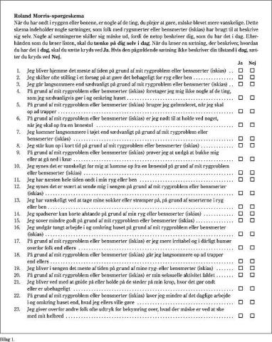 RMQ blev oprindelig udviklet i 1982 af Martin Roland og Richard Morris (6). I 1995 blev skemaet modificeret således, at også patienter med iskiassmerter blev omfattet af spørgsmålene. I denne undersøgelse blev der anvendt den modificerede udgave, der består af 23 udsagn (Bilag 1 ). Hvert spørgsmål kan besvares med ja eller nej, alt efter om udsagnet passer på patienten. Hvert ja-svar giver 1 point, og skalaen går derfor fra 0 til 23, hvor 0 er ingen funktionsnedsættelse og 23 er voldsom reduktion af funktionsniveauet. Formålet med undersøgelsen var at foretage en konvergent kriterievalidering af en dansk oversættelse af RMQ i forhold til Low Back Pain Rating Scale og fysisk funktionsskalaen fra SF-36.