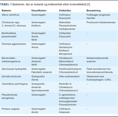Slemme infektioner kan forårsages af den noget usædvanlige bakterieflora hos krokodiller (se Tabel 1), som normalt er et særsyn i dansk kontekst [1-3]. Sparsom viden og erfaring med skader forårsaget af krokodillebid vanskeliggør behandling og prioritering af indgreb i sådan en situation.