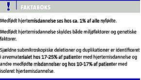 Medfødt hjertemisdannelse ses som en del af sygdomsbilledet ved et antal mikrodeletionssyndromer [2-13] (Tabel 1 ). De hyppigst forekommende er 22q11.2-deletionssyndrom, 22q11.2DS (hyppighed 1:6-4.000) og Williams-Beuren syndrom (WBS) (hyppighed 1:7.500).