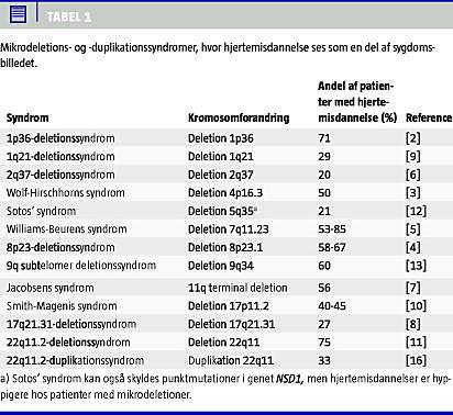 I løbet af de seneste år er der identificeret et antal nye mikrodeletionssyndromer, hvor medfødt hjertemisdannelse er en del af sygdomsbilledet, herunder 1q21-deletionsyndrom [9], 1p36-deletionssyndrom [2], 2q37-deletionssyndrom [6], 8p23-deletionssyndrom [4], 9q subtelomerisk deletionssyndrom [13] og 17q21.31-deletionssyndrom [8] (Tabel 1).
