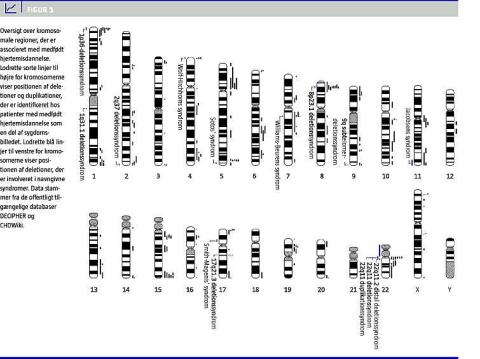 Den store udbredelse af ArrayCGH-analyse har ført til identifikation og præcis kortlægning af et stort antal submikroskopiske deletioner og duplikationer hos patienter, hvor medfødt hjertemisdannelse ses i kombination med andre medfødte defekter (Figur 1 ). Disse CNV'er kan identificeres blandt 17-25% af denne gruppe patienter [17, 18]. Da der hele tiden opdages nye syndromer, kan det ikke udelukkes, at fænotypen hos nogle af disse patienter i virkeligheden skal betragtes som sjældne syndromer.