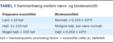 Nasal polyp-eosinofiltælling er en vigtig markør for sygdoms sværhedsgrad ved type 2-inflammation hos patienter med CRSwNP. Således kan normal blodeosinofili godt være forbundet med svært forhøjet polypeosinofili, dårlig prognose og høj recidivtendens (recalcitrant disease), Blodeosinofili er dog en let anvendelig biomarkør også ved CRS, hvor et højt blodeosinofiltal (f.eks. > 0,250 × 109/l) ofte vil være forbundet med et samtidigt højt polypvævs eosinofiltal (i.e. > 10 eosinofile celler pr. tællefelt) (Tabel 1).