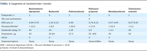 Grundpillen i den medicinske antiinflammatoriske behandling ved CRS er nasale steroider. Ved mild sygdom kan de tages én gang dagligt, ellers er der behov for to gange dagligt. Yderligere gange har ikke vist øget effekt, men dette er afhængigt af præparatvalg. Korrekt administration er altafgørende. Ved nedsat lugtesans kan man med fordel bruge steroidholdige næsedråber [6]. Nasalsteroid har få bivirkninger. Effekten indtræder efter 2-4 uger. Ved valg af præparat skal der tages hensyn til pris, doseringsform og eventuel allergi (Tabel 3).