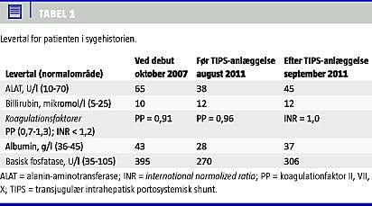 På indikationen behandlingsrefraktær ascites blev patienten henvist til anlæggelse af transjugulær intrahepatisk portosystemisk shunt (TIPS). Patientens leverparametre var stadig kun ganske let påvirkede (Tabel 1).