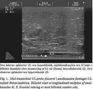Hos de patienter, der blev behandlet med botulinum-toksin (Botox), blev dette under fuld anæstesi injiceret under vejledning af en biplan TRUS-scanner (Fig. 1). I alt 20 enheder blev placeret intersfinkterisk i fire depoter og/eller ved underkanten af m. puborectalis. Stoffet blev injiceret i det intersfinkteriske rum, fordi dette er UL-mæssigt veldefineret, samtidig med at placering her vil tillade binding både til den interne og eksterne sphincter. Syv af de ni patienter som fik injektion af botulinum-toksin accepterede, at der blev taget en UL-vejledt biopsi af analsphincter.