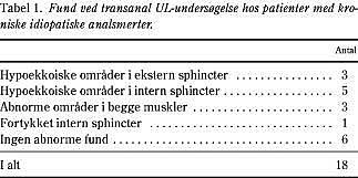Introduktion: Ætiologi og patogenese til kronisk, idiopatisk analt smertesyndrom er ukendt. Formålet har været at undersøge, om analfysiologiske parametre og eventuelle strukturelle abnormiteter påvist ved intraanal UL-undersøgelse kunne bidrage med information om patogenesen til syndromet; endvidere at analysere resultatet af de forskellige behandlinger, der har været forsøgt.