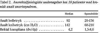 Resultater: Analfysiologisk undersøgelse var hos alle på nær én patient inden for normalområdet. UL-undersøgelse viste abnorme fund hos 12. Defækografi viste hos en patient en mindre, distal invagination, men var normal hos de øvrige. Nitroglycerinsalve havde effekt hos en af fire patienter, hvor det blev forsøgt, butolinum-toksin-injektion hos fire af ni. To patienter blev først smertefri efter anlæggelse af kolostomi, og hos 12 af de 18 patienter blev den endelige behandling analgetika.