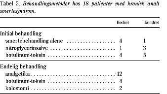 Injektion af butolinum-toksin medførte markant bedring hos fire af ni patienter. Hos alle fire har effekten holdt sig i observationsperioden fra 12 til 24 måneder. Hos to af disse patienter fandtes ved TRUS distinkte hypoekkoiske bånd i den eksterne sphincter, hvorfra biopsi viste fibrose. Hos to af de patienter, hvor butolinum-toksin var uden blivende effekt, blev behandlingen gentaget efter tre måneder, men nu uden effekt. Én patient havde en kortvarig effekt og samtidig et fald i analt hviletryk på 12%. Fornyet injektion gav samme fald i hviletryk, men var uden klinisk effekt, og patienten fik en kolostomi, som medførte smertefrihed, foreløbig med en observationstid på to år. Hos seks af de ni patienter, som fik denne behandling, blev der som kontrol udført anal manometri. Kun én patient havde et signifikant fald i hviletryk, men hos denne patient var behandlingen uden effekt. Hos de fire patienter, hvor behandlingen var effektiv, havde to et moderat fald (10% og 15%) i analt hviletryk, mens trykket var uforandret hos de to andre. Behandling med butolinum-toksin var således effektiv hos 22% (95% sikkerhedsgrænser: 6-47).
