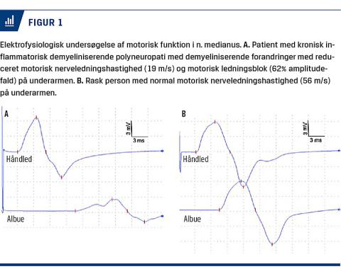 CIDP-diagnosen stilles på baggrund af anamnese og kliniske fund og bekræftes ved elektrofysiologisk undersøgelse, hvor der påvises demyelinisering af de perifere nerver. Demyelinisering viser sig ved motorisk ledningsblok og nedsat nerveledningshastighed (Figur 1). Vha. elektrofysiologisk undersøgelse vil man kunne adskille CIDP fra andre mere hyppige neuropatier, der