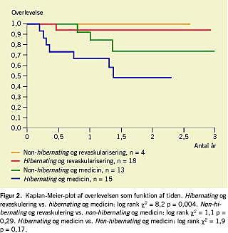 I grupperne af patienter, der havde HIB, var der signifikant forskel mellem de medicinsk behandlede og de revaskulariserede på følgende punkter: EF, opfølgningstid, overlevelse og pludselig død. De revaskulariserede patienter havde signifikant bedre overlevelse end dem, der fik medicinsk behandling. Der var en markant øget hyppighed af pludselige dødsfald blandt patienter, der havde HIB og blev medicinsk behandlet (fem dødsfald), mod ingen pludselige dødsfald blandt de øvrige patienter i materialet (p = 0,003). Alle øvrige dødsfald skyldtes hjertepumpesvigt.