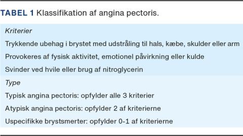 Symptomer på KKS varierer, men kardinalsymptomet er angina pectoris (Tabel 1). Tærsklen for angina pectoris er typisk lavere om morgenen, efter måltider og i kulde. Canadian Cardiovascular Society klasse I-IV benyttes til at beskrive, ved hvilket aktivitetsniveau angina pectoris forekommer og dermed sværhedsgraden af typisk angina pectoris. Dyspnø kan optræde samtidig med angina pectoris, men kan også være eneste symptom på KKS (anginaækvivalent). Epigastrielt ubehag, træthed og kvalme kan også være tegn på KKS [2, 4]. KKS kan også primært manifestere sig som kronisk hjertesvigt. Et stort antal personer har asymptomatisk IHS.