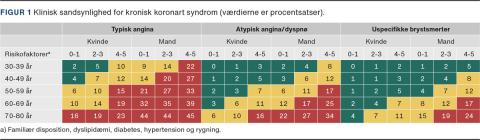 Den kliniske sandsynlighed (KS) for KKS kan bestemmes ud fra alder, køn, symptomer og risikofaktorer (Figur 1). Den samlede KS for KKS beror endvidere på tilstedeværelse af forandringer på hvile-ekg, fokal systolisk dysfunktion ved ekkokardiografi og eventuelt vurdering af omfanget af kalk i koronararterierne (koronar calciumscore) bedømt ved hjerte-CT. Dog udelukker en calciumscore på 0 ikke betydende koronararteriesygdom, som kan være forårsaget af ikkekalcificerede aterosklerotiske læsioner [7].
