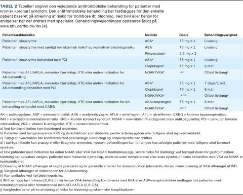 I Tabel 2 opsummeres de nationale behandlingsvejledninger for antitrombotisk behandling ved KKS. Valget af antitrombotisk behandling bør altid baseres på en afvejning af risiko for trombose ift. blødning. Alle patienter uden indikation for antikoagulationsbehandling behandles med acetylsalicylsyre livslangt, medmindre der er kontraindikationer. Den relative risikoreduktion af mortalitet ved behandling med acetylsalicylsyre hos patienter med KKS er ca. 13% [18]. Den antitrombotiske behandling efter perkutan koronarintervention (PCI) individualiseres og fastsættes som udgangspunkt af PCI-operatøren. Ved tvivl eller behov for pausering/afvigelser bør der drøftes med specialist. For alle patienter skal risikoen for gastrointestinal blødning vurderes, og ved forhøjet risiko bør en protonpumpehæmmer tillægges.