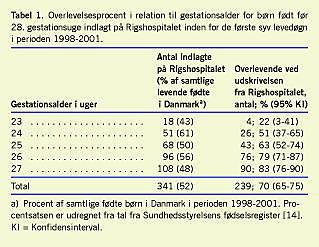 I perioden 1998-2001 blev der på GN i alt indlagt 341 børn med gestationsalder < 28 uger inden for deres første syv levedøgn. Børnene udgjorde 52% af samtlige danske børn født før den 28. gestationsuge i denne periode (Tabel 1 ). I alt 102 børn døde under indlæggelsen, af disse døde 70 børn (69%) i første leveuge.