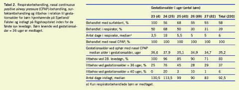 Tabel 2 viser data vedr. respiratorisk støtte i kohorten. 61% af kohorten blev aldrig behandlet i respirator under indlæggelsen på GN. Behovet for iltbehandling var 37% ved alder svarende til 36 gestationsuger. Andelen af børn med behov for iltbehandling faldt til 6% ved alder svarende til 40 gestationsuger.
