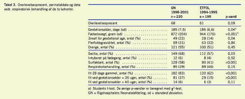 I Tabel 3 sammenlignes de to kohorter af børn med gestationsalder < 28 uger: 220 børn i GN-kohorten sammenlignes med 195 børn fra ETFOL-kohorten, der omfattede samtlige børn, der var indlagt i Danmark i 1994-1995.