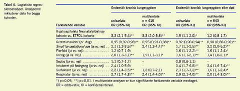 I Tabel 4 vises de to logistiske regressionsanalyser omfattende data fra begge kohorter. I den univariate analyse med CLD som effektmål findes prædiktorer for udvikling af CLD. Gestationsalder (jo lavere gestationsalder desto større risiko for CLD), SGA, drengekøn, surfaktant- og respiratorbehandling var alle signifikante i univariate analyser. I multivariate analyser, hvor de forklarende variable, der var signifikante i de univariate analyser, er medtaget, er der stadig signifikant (odds-ratio (OR) = 3,3, p < 0,01) større risiko for, at der udvikles CLD i GN-kohorten end i ETFOL-kohorten.