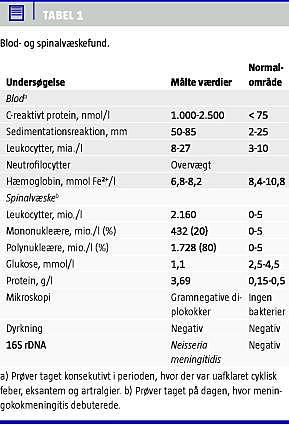 Tilfældet blev efterhånden opfattet som primær vaskulitis/adult morbus Still og behandlet med Prednisolontabletter 50 mg/dag i to uger efterfulgt af pulskur (1.000 mg/dag i tre dage). På tredjedagen af pulskuren udviklede patienten meningealia. G-penicillin og ceftriaxon blev administreret umiddelbart inden lumbalpunkturen. Spinalvæsken var purulent (Tabel 1). Mikroskopi viste gramnegative diplokokker. Speciesspecifik polymerasekædereaktion (PCR) var forenelig med N. meningitidis .