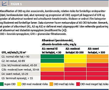 Kidney Disease: Improving Global Outcomes (KDIGO), der er en international organisation med det formål at udarbejde retningslinjer for udredning og behandling af nyresygdomme, har netop udgivet nye guidelines for klassifikation og håndtering af CKD (Figur 1) [4]. Den nye og udvidede klassifikation inddrager både nyrefunktionen målt ved glomerulær filtrationsrate (GFR), eller estimater heraf (eGFR), og graden af albuminuri og den bagvedliggende årsag, når den er kendt. Ved analyser har man dokumenteret en association mellem eGFR, albuminuri og risikoen for død, kardiovaskulær sygdom og terminalt nyresvigt [2]. Den nye klassifikation er således ledsaget af en risikostratificering til identifikation af højrisikopatienter, som bør følges tæt med henblik på kontrol af risikofaktorer og eventuelt henvises til en nefrolog. Dette åbner mulighed for en mere differentieret tilgang til patienter, der – måske tilfældigt – får konstateret nedsat nyrefunktion. Samtidig betones nødvendigheden af at kvantificere urinalbuminudskillelsen og om muligt at udrede årsagen til den nedsatte nyrefunktion. Det er værd at bemærke, at også risikoen for akut nyresvigt er associeret med eGFR og albuminuri [2], og kendskab til klassifikationen vil kunne hjælpe til at identificere patienter, der kræver særlig opmærksomhed ved akut sygdom eller større kirurgiske indgreb, således at nyrepåvirkningen minimeres, og eventuelt nyresvigt identificeres tidligt.