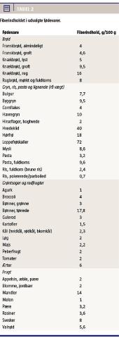 (Tabel 4). I stedet anbefales gulerødder, grønne bønner, knoldsellerier, tomater, kartofler, bananer, appelsiner og bær [2, 29]. Øget væskeindtag har næppe nogen virkning alene, men øger effekten af fibrene. Derfor tilrådes det at drikke to liter væske (overvejende vand) dagligt. Det daglige fysiske aktivitetsniveau tilrådes øget med en halv times daglig motion af let til moderat intensitet. God defækationspraksis indbefatter også regelmæssighed, undgåelse af kraftig pressen og ændring af siddestilling i retning af hugsiddende.