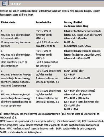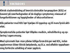 Anbefalinger vedrørende klinisk stadieinddeling af KOL har gennemgået en stor forandring i løbet af det seneste år. Den nye kliniske inddeling stratificerer patienterne i grupperne A, B, C og D på baggrund af sværhedsgraden af de daglige symptomer, lungefunktionsniveau, og hyppigheden af eksacerbationer. Alle patienter med KOL bør hjælpes til rygestop og til mere fysisk aktivitet. Symptomatiske patienter bør tilbydes medicin og rehabilitering. Øget fokus på kvalitetssikring af KOL-behandling på sygehusene og i almen praksis ventes at give gevinst i de kommende år. Det er imidlertid mindst lige så vigtigt at opdage sygdommen tidligt inden udvikling af svær lungefunktionsnedsættelse. Dette kan kun gøres ved i henhold til Sundhedsstyrelsens anbefalinger at øge antallet af spirometrier i almen praksis.