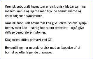 Kronisk subduralt hæmatom (KSDH) opstår som følge af en mindre, i reglen uerkendt, akut subdural blødning. Om end nogle af disse blødninger absorberes spontant, opstår der hos et ukendt antal patienter vækst i hæmatomets størrelse, hvilket medfører symptomgivende kompression af hjernen. Denne vækst opstår formentlig som følge af nye mindre blødninger fra fragile nydannede kar og som følge af koagulativ dysfunktion i hæmatomet. Der findes forskellige metoder til behandling af tilstanden. Valget af behandling er til dels afhængig af hæmatomets radiologiske fremtræden og patientens kliniske tilstand. Behandlingen af symptomgivende KSDH er primært kirurgisk med anlæggelse af et kranialt borhul og udtømning af hæmatomet. Uafhængigt af valget af kirurgisk teknik synes der at være god klinisk effekt i 80-90% af tilfældene med en recidivfrekvens på ca. 10%. Den patofysiologiske viden har endnu ikke fået betydning for den standardiserede behandling af lidelsen. Litteraturen, som ligger til grund for artiklen, er fundet gennem specifik søgning på litteraturdatabasen MEDLINE.