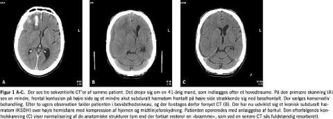 Efterhånden som KSDH modnes, skifter dets CT-udseende fra hyperdenst (frisk blod/koagler) til isodenst og derefter til hypodenst [14], en proces som tager 2-4 uger (Figur 1 ). Akut blødning i det eksisterende hæmatom fører til et CT-udseende med vekslende hypodense og hyperdense områder [8, 15]. Hyperdensitet i hæmatomkaviteten er udtryk for frisk blod med dannelse af koagler. Iso- og hypodense hæmatomer er i reglen helt flydende uden koageldannelse.