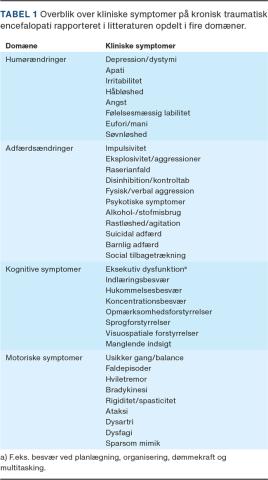 KTE ses typisk flere år efter eksponering for gentagne slag mod hovedet og adskiller sig herved især fra hjernerystelse og det postkommotionelle syndrom, hvor symptomerne ses umiddelbart efter et enkelt hovedtraume [10]. Desuden er postkommotionelt syndrom karakteriseret ved et godartet og typisk selvbegrænsende forløb, og langt de fleste er symptomfrie tre måneder efter hovedtraumet [11]. Det er uvist, om der findes en nedre tærskel for antallet, intensiteten eller varigheden af udsættelse for hovedtraumer for udvikling af KTE. Der findes ingen validerede kliniske diagnostiske kriterier for KTE. De kliniske symptomer, der er beskrevet i litteraturen, er ofte indhentet retrospektivt fra pårørende efter post mortem-undersøgelser og indebærer en risiko for informationsbias og selektionsbias [6]. I flere studier er der beskrevet progredierende symptomer over tid hos > 90% [10]. Symptomer ved KTE kan opdeles i fire overordnede domæner, som fremgår af Tabel 1: 1) humørændringer, 2) adfærdsændringer, 3) kognitionssvækkelse og 4) motoriske symptomer [7, 10]. Denne spændvidde i symptomer afspejler formentligt, at hele hjernen kan påvirkes, afhængigt af den enkelte patients eksponering og forekomst af andre komorbiditeter.