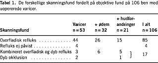 Som det fremgår af Tabel 1, ville de objektive fund ikke være til nogen hjælp, fordi selv de såkaldt alvorlige objektive fund var forbundet med enten overfladisk eller dyb insufficiens. Ødem var i dette materiale hyppigere, end det sædvanligvis opgives [6]. Årsagen hertil kan være, at ødem er noteret, når blot patienten angav hævelse i løbet af dagen. De 14 tilfælde med blandet dyb og overfladisk refluks drejede sig hovedsagelig om refluks i v. poplitea. Årsagen hertil er oftest følger efter tidligere dyb venetrombose (DVT), som ikke sjældent på dette niveau kan forløbe uden, at patienten har været vidende om DVT-episoden. Der er dog ingen sikre anamnestiske holdepunkter for dette i materialet. At have venøst ulcus cruris leder traditionelt tanken hen på posttrombotiske forandringer, som er uden for kirurgisk rækkevidde. Men i litteraturen dokumenteres, at sår opstår i 2-4% [7] af tilfældene med superficiel refluks. I dette materiale drejede det sig om tre ben med sår (2,8%), som kunne afhjælpes med simpel varicekirurgi.