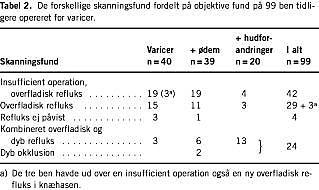 I denne gruppe var varicer det eneste objektive fund i 40 (40%) tilfælde, ødem i 39 (39%) og hudforandringer i 20 (20%) tilfælde. Insufficient operation, dvs. recidiv af varicer sås i 42 (42%) af tilfældene med recidiv i lysken på 30 ben med strippet v. saphena magna, ni ben med efterladt/ikke strippet v. saphena magna og recidiv i knæhasen i tre tilfælde.