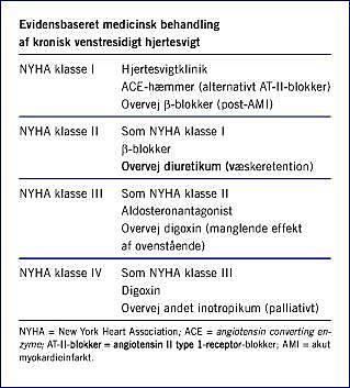 Summary Chronic left heart failure: a focus on the pathogenetic basis of medical treatment Ugeskr Læger 2006;168(19):1854-1856 Chronic left heart failure is the result of the activation of pathophysiological mechanisms which over time lead to progressive deterioration of the cardiac function. As pharmacotherapy aims at these mechanisms and as treatment possibilities are increasing, we find it relevant to provide a survey. Treatment evidence is based mainly on systolic dysfunction. It consists of angiotensin-converting enzyme inhibitor, aldosterone antagonist, β -blocker, digoxin and diuretics. Incorporation of evidence-based medicine and treatment of diastolic dysfunction should be focussed on in the future.