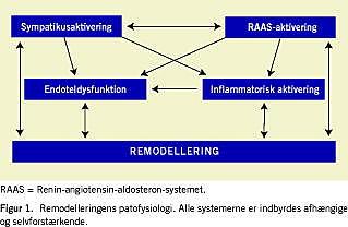 Den ætiologiske sygdom medfører sædvanligvis uhensigtsmæssig forandring i venstre ventrikels geometri. Denne benævnes remodellering og skyldes cellulære forandringer i myokardiet, aktivering af det sympatiske nervesystem, renin-angiotensin-aldosteron-systemet (RAAS) og flere andre systemer (Figur 1 ).