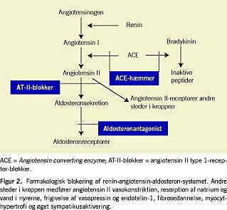 Den øgede aldosteronsekretion medfører natriumresorption og kaliumudskillelse, sympatikuspotentiering, myocythypertrofi og fibrosedannelse samt øger antallet af endotelinreceptorer og øger cytokinproduktionen [1, 2]. Vasopressin er vasokontraherende og har en udtalt antidiuretisk effekt. Angiotensin converting enzyme (ACE) medfører endvidere nedbrydning af det vasodilaterende stof bradykinin [2].