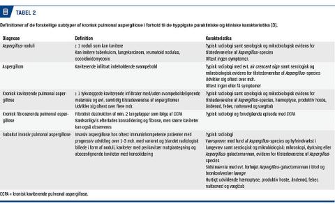 CPA er en paraplydiagnose, der dækker over subtyperne Aspergillus-noduli, aspergillom, kronisk kaviterende PA (CCPA), kronisk fibroserende PA (CFPA) og subakut invasiv PA (SAIA). Tidligere har SAIA været benævnt semiinvasiv PA og kronisk nekrotiserende PA (CNPA), men inden for de senere år er terminologien ensrettet til betegnelserne i Tabel 1 [3]. Definitioner på de forskellige CPA-subtyper fremgår af Tabel 2 og radiologiske eksempler af (Figur 1, Figur 2 og Figur 3).