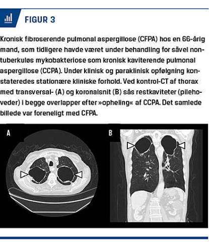 Kroniske pulmonale aspergilloser (CPA) er en overset og underdiagnosticeret sygdomskategori [1, 2]. Der foreligger ikke konsistente epidemiologiske data for CPA, men det estimeres, at der på verdensplan er mere end 3.000.000 afficerede personer [3], og at tilstanden forårsager mere end 450.000 dødsfald pr. år [4]. I et nyere dansk studie har man på baggrund af registerdata opgjort incidensraten og prævalensen af CPA i Danmark til hhv. 4,8/100.000 personår og 270/år [5]. Mortalitetsraten i Danmark er endnu ukendt. Den kliniske og radiologiske præsentation af CPA er sjældent åbenlys, idet CPA oftest optræder som et kontinuum med overlappende syndromer, hvor en subtype kan transformere sig til en anden. CPA er således en kompleks og udfordrende diagnose, der kræver flere tilstedeværende kriterier for at være opfyldt. Da CPA samtidig optræder med snigende symptomer, der kan overlappe med patientens eksisterende lungesygdom, overses CPA ofte med fatale konsekvenser til følge, idet CPA ubehandlet kan føre til invasiv sygdom eller lungefibrose med en femårsmortalitet på op til 80% [2, 6].