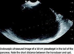 Pseudocyster i pancreas er væskeansamlinger, der er omgivet af en kapsel bestående af granulationsvæv og fibrøst væv. De opstår som komplikation til akut eller kronisk pancreatitis. De fleste pseudocyster er små og forsvinder uden behandling. Der er indikation for behandling, hvis en pseudocyste persisterer og giver symptomer. Perkutan aspiration er en ofte benyttet behandlingsform, men recidivraten er høj. Endoskopisk transmural drænage er en minimalt invasiv behandlingsform, hvorved der indsættes en stent mellem pseudocysten og mave-tarm-kanalens lumen. For at øge sikkerheden sker indsættelsen af stenten under vejledning af endoskopisk ultralyd (EUS).