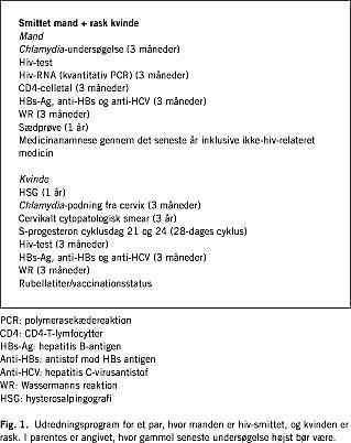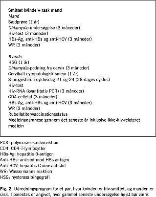 Tidligere har man fra lægelig side frarådet par, hvor den ene var hiv-positiv, at forsøge at opnå at få »fælles« barn. Baggrunden var sygdommens alvorlige prognose og risikoen for såvel horisontal som vertikal transmission af virus. Ny og mere effektiv behandling af patienter med hiv-infektion har imidlertid gjort det nødvendigt at tage stilling til, om denne meget restriktive holdning fortsat er rimelig. Livstidsprognosen for hiv-positive, der behandles med potent antiretroviral kombinationsbehandling, er nu 15-20 år eller formentlig længere [1]. Endvidere har man fået større viden om faktorer af betydning for transmission, og man kan i dag vurdere risikoen for mor til barn-smitte ret nøjagtigt hos den enkelte kvinde [2].
