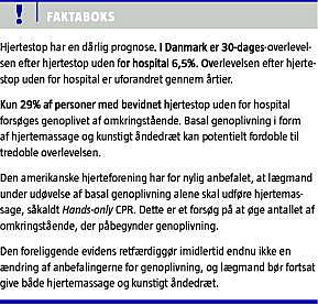Hjertestop har en dårlig prognose. I Danmark er 30-dagesoverlevelsen efter hjertestop uden for hospital 6,5%. Kun 29% af personer med bevidnet hjertestop uden for hospital forsøges genoplivet af omkringstående [1]. Dette er analogt til internationale forhold. Overlevelsen efter hjertestop uden for hospital er uforandret gennem årtier [2]. Basal genoplivning i form af hjertemassage og kunstigt åndedræt kan potentielt fordoble til tredoble overlevelsen [3]. Den Amerikanske Hjerteforening har for nylig anbefalet, at lægmand under udøvelse af basal genoplivning alene skal udføre hjertemassage, såkaldt Hands-only CPR, og kun i særlige situationer give kunstigt åndedræt [4]. Hovedargumenterne for hjertemassage alene er den lille andel af de omkringstående der yder basal genoplivning ved hjertestop samt et ønske om at forenkle genoplivningsproceduren.