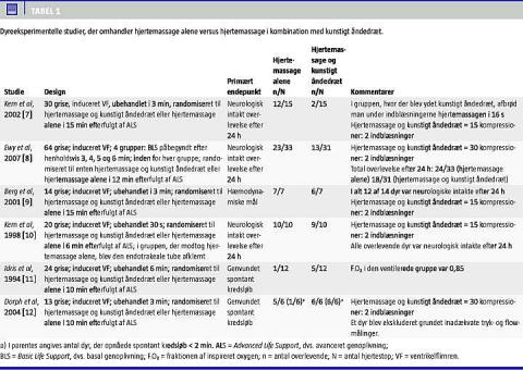 Alle de eksperimentelle studier (Tabel 1) er udført på unge, hjerteraske dyr. Ved elektrisk stimulation induceres ventrikelflimren i ikkeiskæmiske, strukturelt normale hjerter. I de fleste af de anvendte forsøgsopstillinger lades dyrene kun kortvarigt (sekunder til få minutter) ubehandlede før genoplivning initieres, og overlevelsen er i alle studierne nær 100%. Dette afspejler ikke den kliniske virkelighed. Ydermere bibeholder grisen under genoplivning frie luftveje, hvilket under pågående hjertemassage muliggør passiv ventilation. Blodgasværdierne (PaO2 og PCO2 ) var i et studie under kontinuerlig hjertemassage næsten identisk med gruppen, hvor der blev givet både hjertemassage og indblæsninger [19]. I en retrospektiv opgørelse af hjertestop uden for hospital fandt man en signifikant association mellem øget overlevelse og agonal vejrtrækning [20]. De anførte metoderelaterede mangler gør det særligt vanskeligt at ekstrapolere til humane forhold.