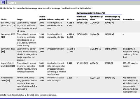 De kliniske studier (Tabel 2) er alle, fraset et, med observationelt design. Denne type studier er behæftet med risiko for bias. I de nævnte studier er det endvidere kun en mindre del af studiepopulationen, der forsøges genoplivet med hjertemassage alene. Ingen af studierne foretog en uddannelsesintervention, og det er uvist hvorfor, der i det hele taget blev ydet genoplivning uden kunstigt åndedræt. Det eneste studie med randomiseret design afgiver kun indirekte evidens for hjertemassage alene, idet lægmand modtog telefonisk instruktion af personale på en alarmcentral. Responstiden for ambulancetjenesten var i studiet kun fire minutter. Dette vanskeliggør ekstrapolation til andre områder, herunder Danmark, hvor responstiden normalt er otte minutter eller længere [21]. I de nyeste retningslinjer for genoplivning understreges vigtigheden af hjertemassage, hvilket har medført, at kompressions-ventilations-rationen er øget fra 15:2 til 30:2 [22]. Ingen af de kliniske studier har foretaget en sammenligning af hjertemassage alene med denne anbefaling. Ydermere har ingen af studierne kunnet kontrollere for kvaliteten af hjertemassagen. Det, at der ikke er påvist en behandlingsforskel mellem hjertemassage alene og hjertemassage i kombination med kunstigt åndedræt, er ikke analogt til at have påvist ækvivalens behandlingerne imellem. Dette vil kræve en analyse af noninferioritet [23], hvilket ingen af studierne har gennemført.