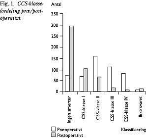 Præoperativt lå CCS-klassevægten i klasse II-III. Postoperativt lå den i »Ingen smerter« og klasse I, og ganske få patienter befandt sig i klasse III og IV (Fig. 1), det vil sige en markant bedring af smerteniveau vurderet ud fra CCS-klasserubricering præ/postoperativt.