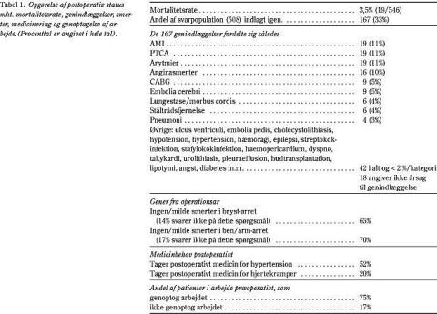 Postoperativt, non-letalt AMI på 11%, som det findes i Gentoftestudiet, genfindes i et norsk studie fra 1997 (16). I et svensk studie registreres komplikationer, der forlænger indlæggelsen. Det drejer sig om samme diagnoser, som ses ved genindlæggelser i Gentoftestudiet. Procentdelen i de enkelte kategorier er generelt lavere i det svenske studie, da løbetiden er kortere og tallene derfor ikke umiddelbart sammenlignelige (17). I det engelske studie behandledes 42% med både antihypertensiv og antianginøs medicin postoperativt (15). I Gentoftestudiet tog kun 12% begge typer medicin, mens 52% tog antihypertensiv medicin. En genindlæggelseshyppighed på 30% kan ud fra flere studier betragtes som forventelig. Årsagerne er: reintervenering, AMI, arytmier, infektioner, apopleksi. Risikoen for at blive ramt af en komplikation er alt i alt betydelig, men for de enkelte komplikationer sjældent over 10%. De mest generende komplikationer er også de hyppigste.