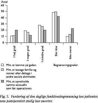 Hos patienter med postoperative smerter (116) begrænsede smerterne ikke patienterne i væsentlige dagligdags aktiviteter, såsom at komme på gaden og have social omgang med andre. For seksuallivets vedkommende udtrykte de fleste uændret adfærd, men en mindre del fandt sig i høj grad begrænset på dette område (Fig. 3).