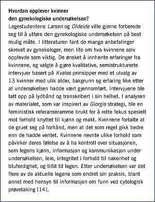 Artikkelen er en bearbeidet versjon av Malterud K. Kvalitative metoder i medisinsk forskning - forutsetninger, muligheter og begrensninger. Tidsskr Nor Lægeforen 2002;122:2468-72.