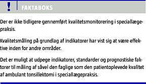 Summary Quality of outpatient tonsillectomy performed in ear, nose & throat practice Ugeskr Læger 2010;172(28):2049-2054 In Danish healthcare there are increasing demands in the field of hospital care on performance and outcome measurement and quality improvement in relation to a number of diseases. Hitherto, corresponding measurements of quality have not been carried out among private specialized practitioners. The present project describes the development and selection of evidence-based national indicators, standards, and case mix factors in terms of prognostic factors with the purpose of measuring quality of out-patient tonsillectomy in Danish ear, nose & throat practices.