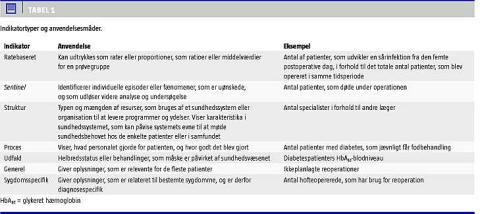 Kvaliteten af sundhedsvæsenets ydelser kan måles på grundlag af sæt af målbare variabler, indikatorer , i relation til specifikke sygdomme med henblik på at vurdere, hvorvidt diagnostik, behandling, pleje og rehabilitering lever op til fastsatte kvalitetsmål, standarder . Indikatorer og standarder bør i videst muligt omfang være evidensbaserede, dvs. genereret på grundlag af den videnskabelige litteratur eller formuleret på baggrund af erfaringer blandt et sundhedsprofessionelt ekspertpanel. Som det fremgår af Tabel 1 kan indikatorer udtrykkes på forskellige måder. Endvidere beskrives prognostiske faktorer: Disse kan defineres som egenskaber, hvis tilstedekomst øger sandsynligheden for en dårligere prognose af en sygdom eller klinisk tilstand efter en given behandling. Eksempelvis øger fortsat rygning efter en blodprop i hjertet risikoen for en ny blodprop i hjertet.